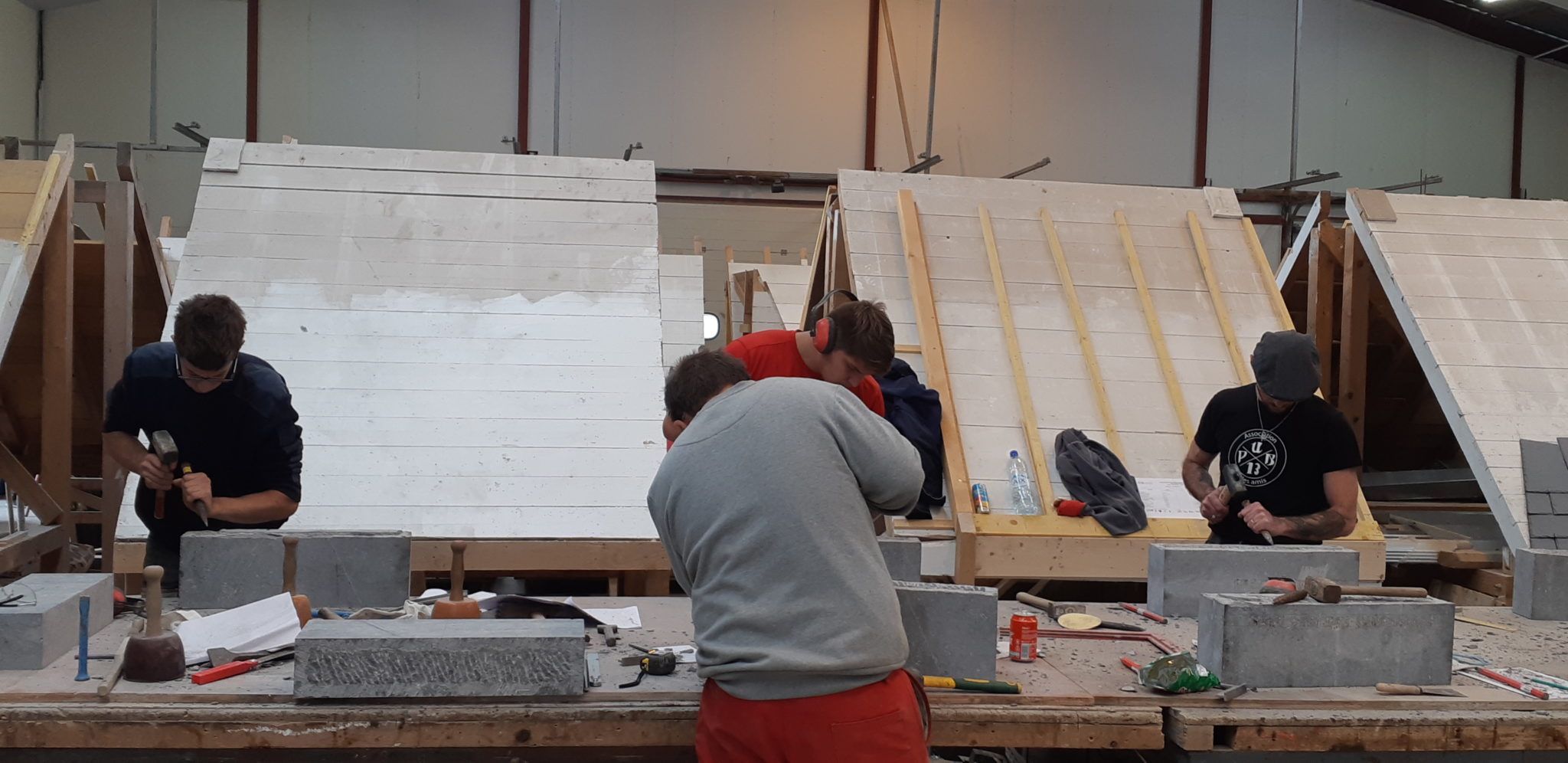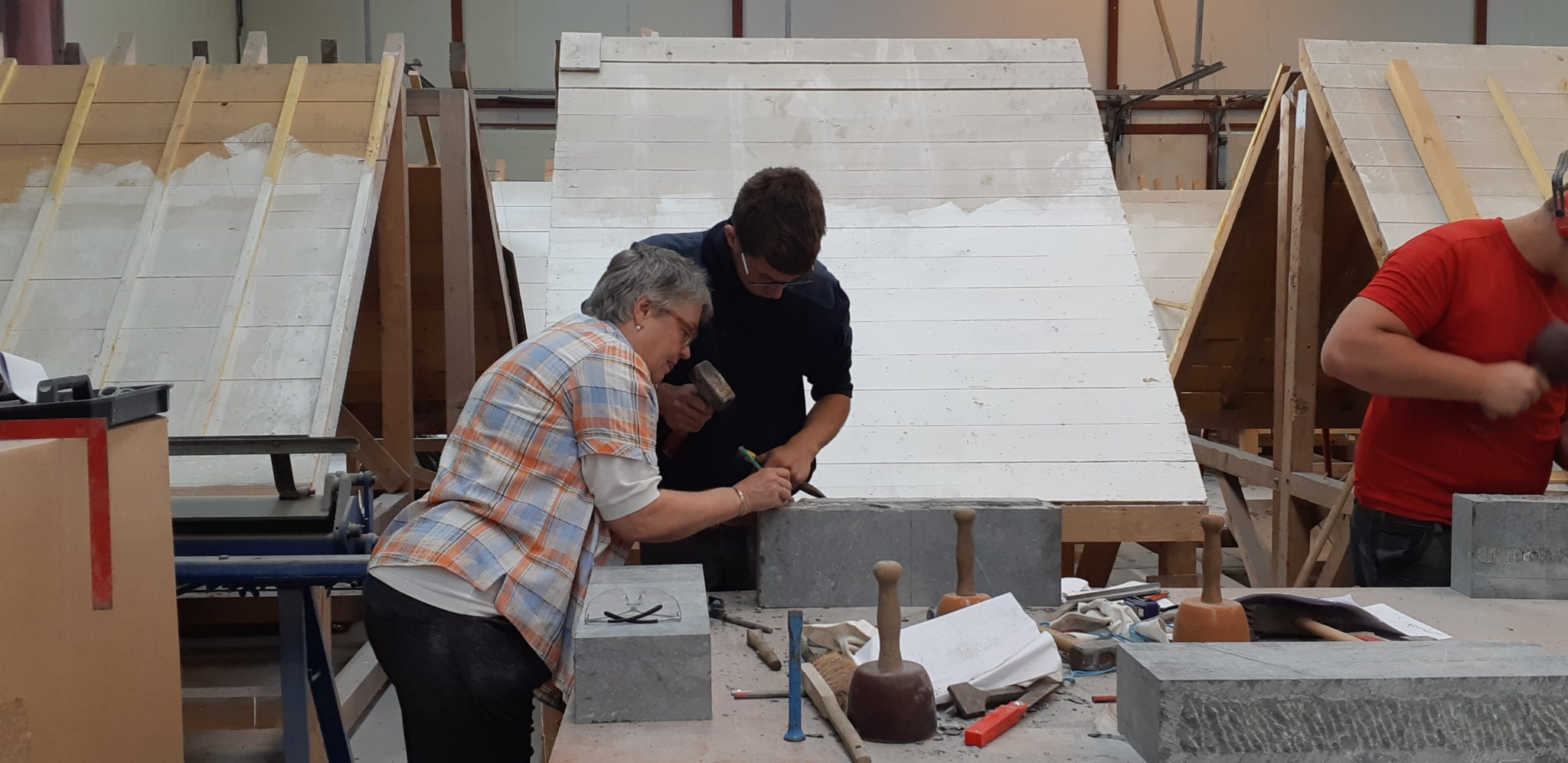 Marie DEBELDER, formatrice au sein de l’Agence Wallonne du Patrimoine (B) a ainsi pu apporter son expertise en matière de techniques de taille de pierre auprès des 8 apprentis maçons.